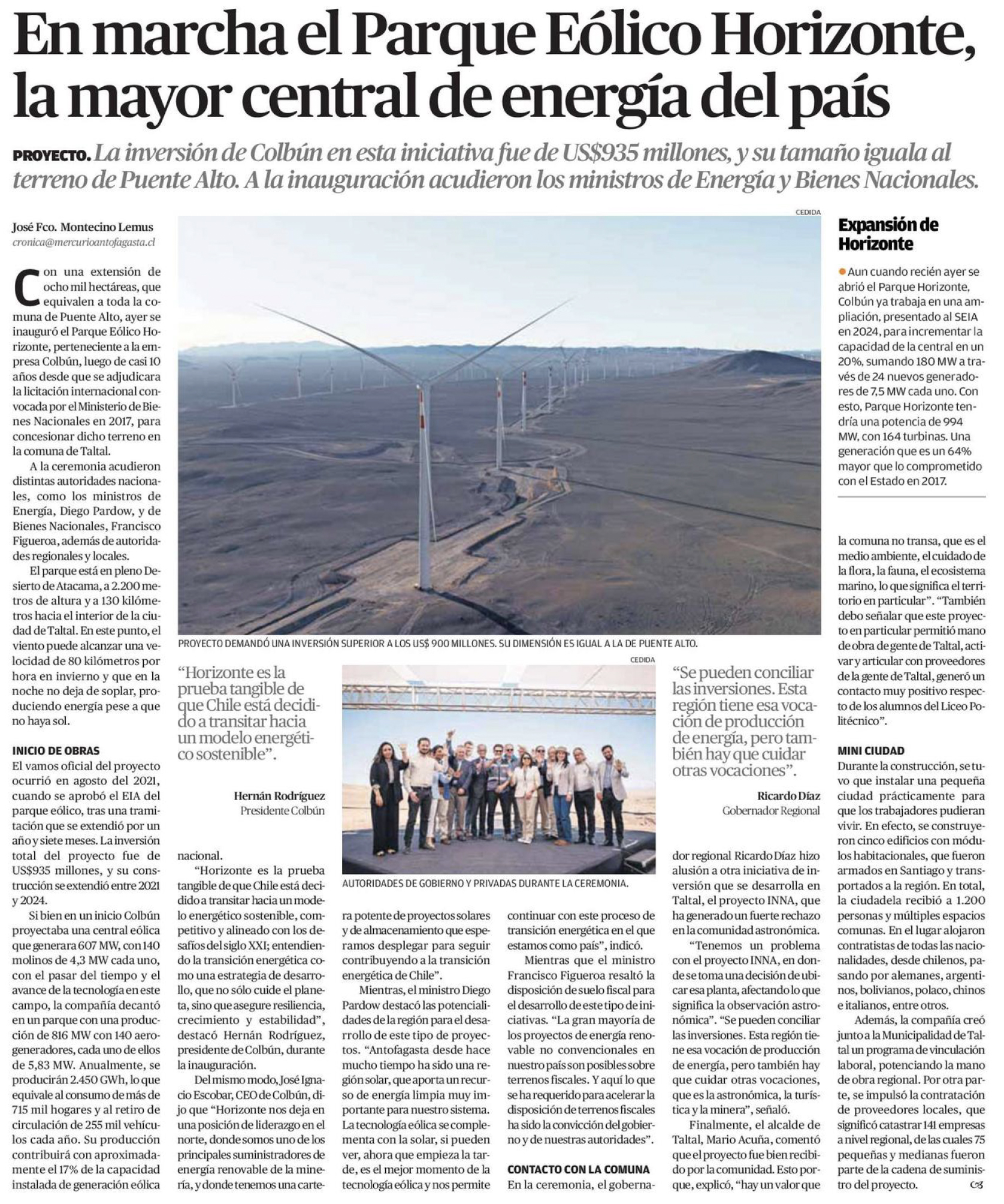 EL MERCURIO DE CALAMA – La inversión de Colbún en esta iniciativa fu de US$935 millones, y su tamaño iguala al terreno de Puente Alto