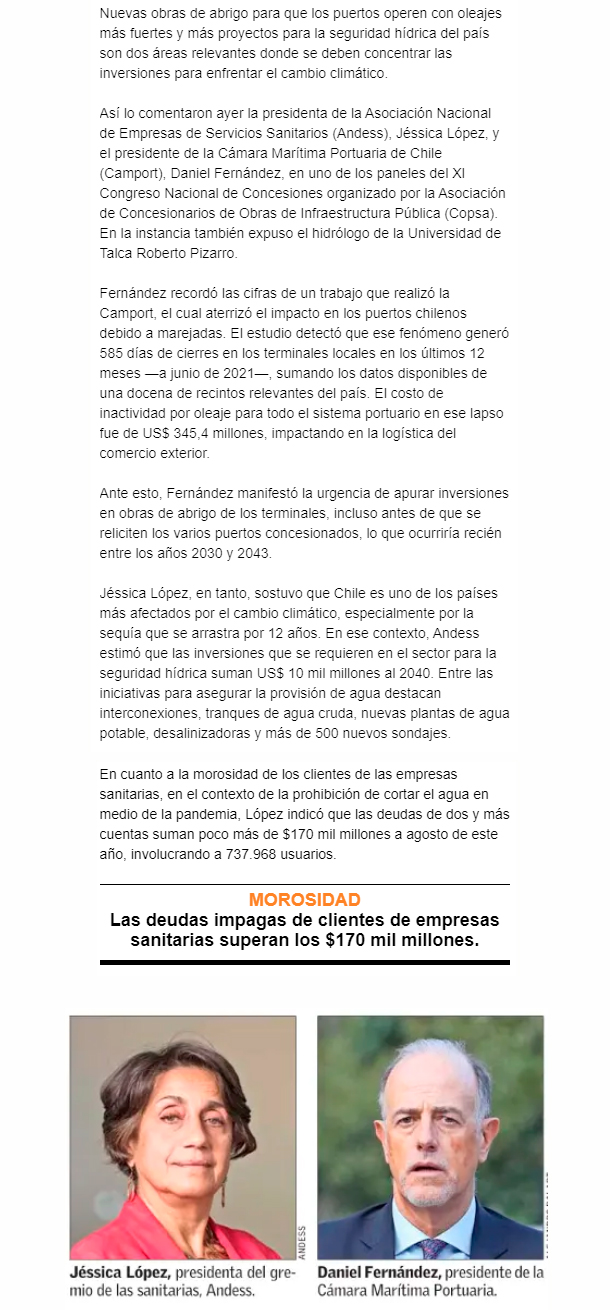 EL MERCURIO – El gremio de las empresas sanitarias estima que se deben invertir US$ 10 mil millones a 2040 para asegurar el agua.