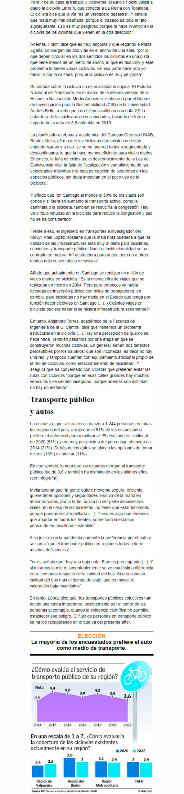 EL MERCURIO – Los expertos aseguran que debe planificarse la ciudad con medios sustentables, lo que incluye estandarizar las rutas, mejorar la infraestructura y concientizar a los usuarios y conductores sobre el espacio vial.