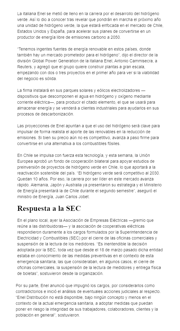 Enel ingresa al negocio del hidrógeno y apunta a Chile