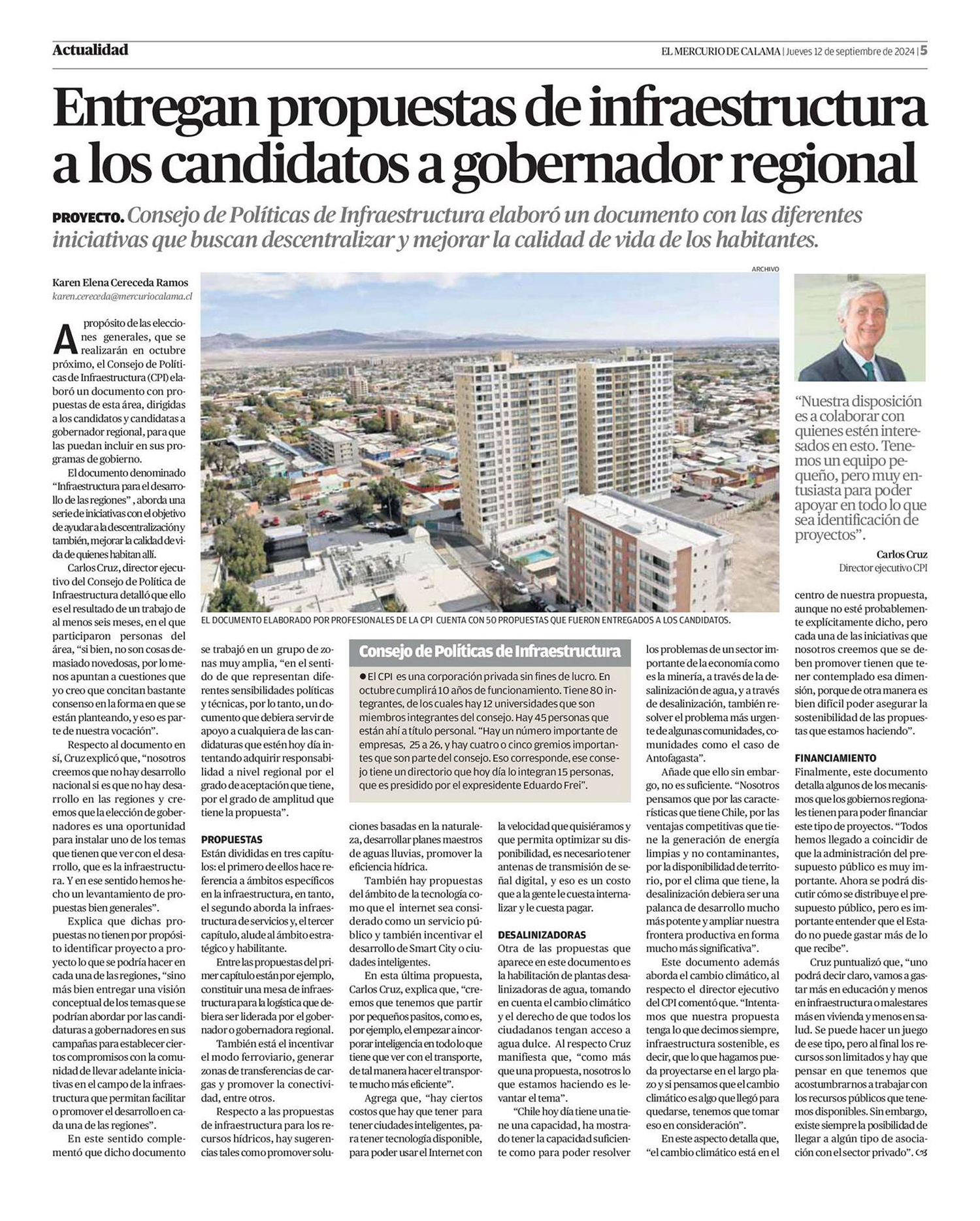 EL MERCURIO DE CALAMA – El Consejo de Políticas de Infraestructura elaboró un documento con las diferentes iniciativas que buscan descentralizar y mejorar la calidad de vida de los habitantes.
