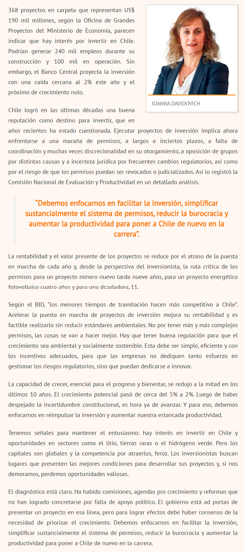 DIARIO FINANCIERO – Debemos enfocarnos en facilitar la inversión, simplificar sustancialmente el sistema de permisos, reducir la burocracia y aumentar la productividad.