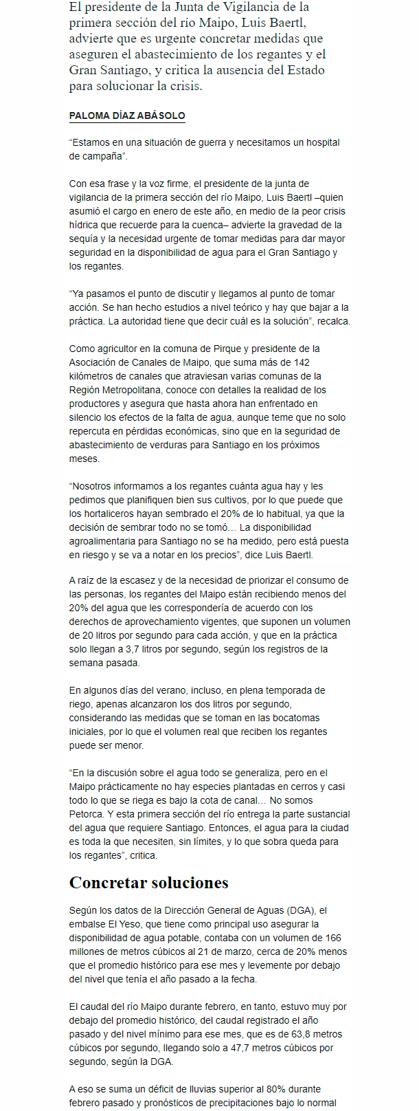 REVISTA DEL CAMPO – Luis Baertl advierte que es urgente concretar medidas que aseguren el abastecimiento de los regantes y el Gran Santiago, y critica la ausencia del Estado para solucionar la crisis