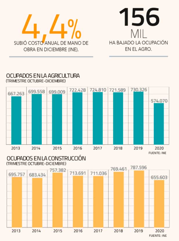 Las últimas cifras del Instituto Nacional de Estadísticas (INE) muestran que la ocupación en la agricultura llegó a 574.070 plazas en el trimestre móvil octubre-diciembre, 156 mil menos que doce meses atrás. Sin embargo, en años previos, el peak se ha alcanzado en el período diciembre-febrero con más de 760 mil trabajadores y, dados los antecedentes que existen hasta ahora, este verano no se llegará a esa cifra.