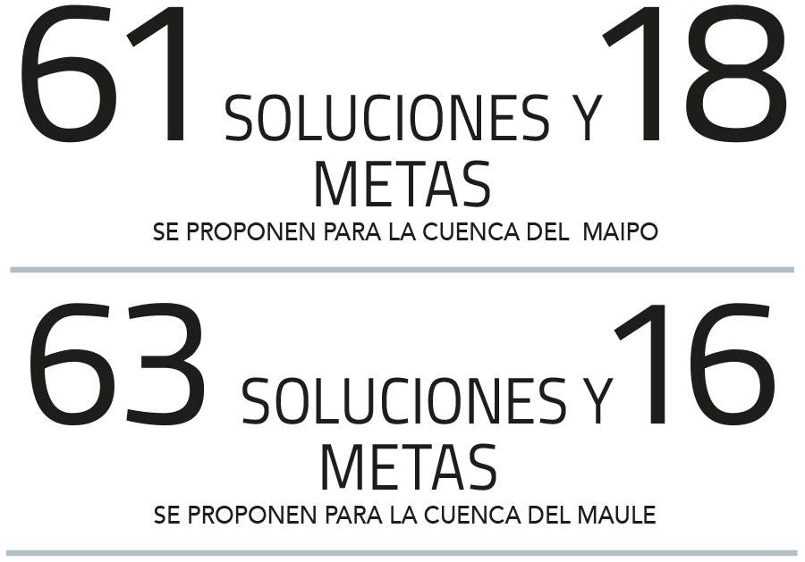Estas soluciones para la cuenca del Maipo buscan alcanzar 18 metas, entre ellas, reducir el consumo de agua urbano en el sector de agua potable y saneamiento; reducir la extracción de agua en el sector industrial en un 40% al 2050; y que el 100% de los caudales de emisarios submarinos sean tratados y reusados.