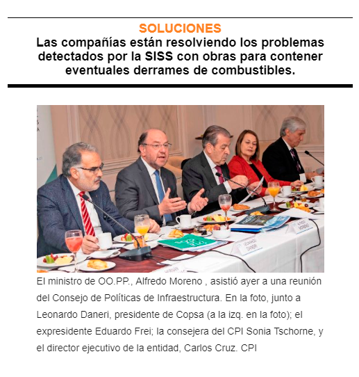 Tras una reunión del Consejo de Políticas de Infraestructura (CPI), donde asistió el ministro de OO.PP., Alfredo Moreno, el presidente de la Asociación de Concesionarios de Obras Públicas (Copsa), Leonardo Daneri, admitió que la situación del rubro sanitario, “contamina a todo el sector”. Esto, porque las personas no diferencian que las concesiones de servicios de agua son diferentes a las de carreteras y aeropuertos, entre otras.