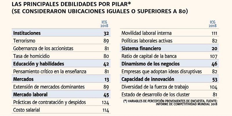 Pero no todo son malas noticias, en esta área, el informe agregó que en el pilar capacidad de innovación la mejor ubicación que tiene el país se observa en la variable calidad de instituciones de investigación, con el puesto 36. Por el contrario, la variable donde se observa peor ubicación es en diversidad de la fuerza de trabajo, con el puesto 104, variable cuyo valor que surge de la encuesta a ejecutivos.