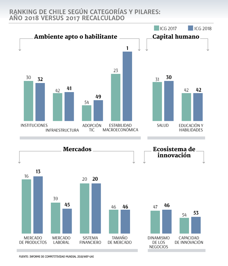 El análisis reveló que Chile ocupa el puesto 33° en la clasificación general -entre 140 economías analizadas- con una puntuación de 70,3 puntos, lo que lo transforma en el país más competitivo de América Latina, liderando en seis de los 12 pilares analizados por el estudio. De esta forma, Chile supera ampliamente a México, Uruguay, Costa Rica y Colombia en la región.