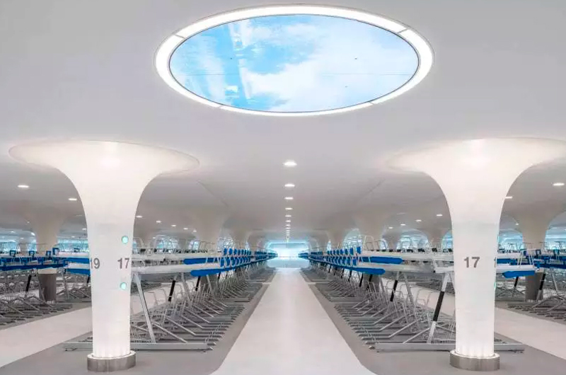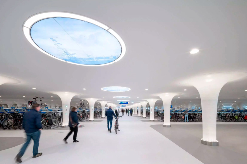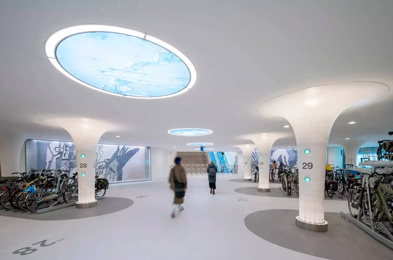Conectado directamente al metro y al sistema ferroviario de la ciudad a través de seis escaleras mecánicas, el espacio submarino es el primero de su tipo en el mundo y proporciona estacionamiento para unas 7.000 bicicletas.