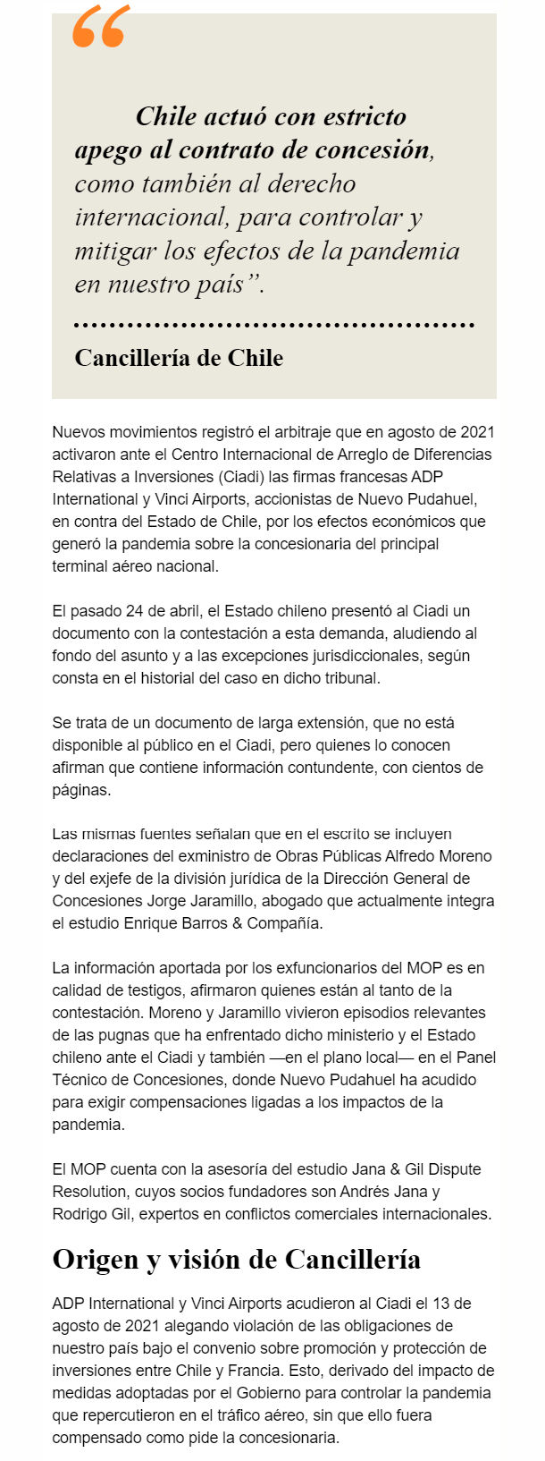 EL MERCURIO – El texto incluye declaraciones del exministro de Obras Públicas, Alfredo Moreno y el exjefe de la división jurídica de la Dirección General de Concesiones, Jorge Jaramillo.