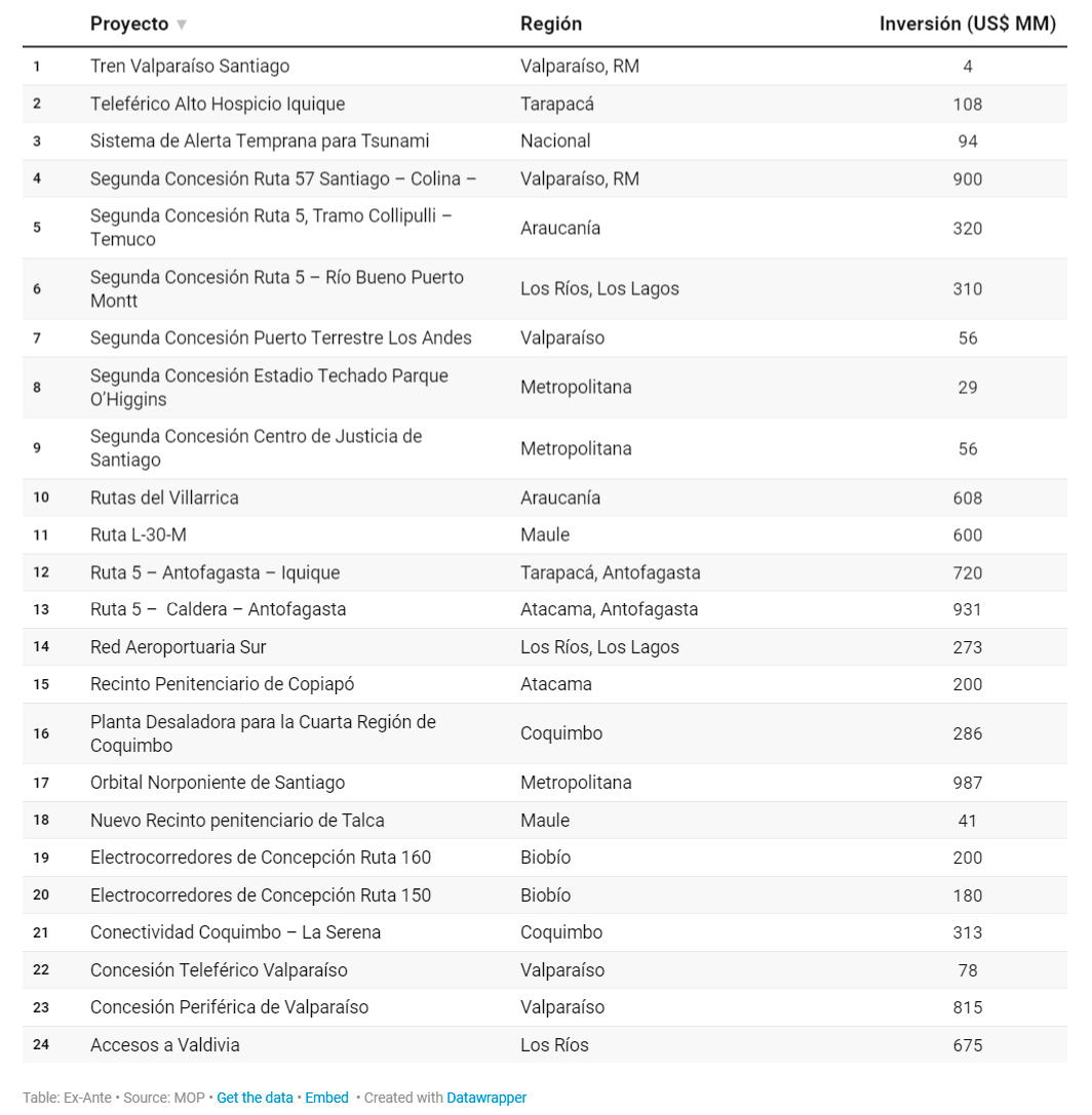 Además, se informó de diez proyectos en proceso de licitación por una suma superior a US$ 6 mil millones que, de adjudicarse en los próximos meses, representan un estímulo importante para la inversión en los próximos años y de una serie de iniciativas que habiendo sido adjudicadas en periodos pasados, han logrado superar los requisitos para el inicio de obras y avanzan hacia su ejecución.