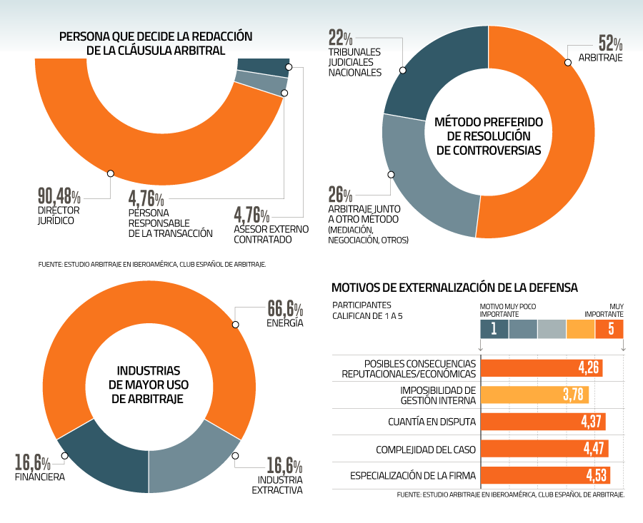 ¿Quiénes son las que más recurren a este mecanismo? Entre las firmas encuestadas que más han acudido a arbitraje (10 o más procedimientos arbitrales en los últimos 5 años), destacan las pertenecientes al sector energético (66,6%), así como a los sectores de industrias extractivas y financiero (16,6%, cada una). Claramente en todos ellos la cualidad más celebrada de este mecanismo es la alta especialización y conocimiento técnico sobre la materia objeto del arbitraje.