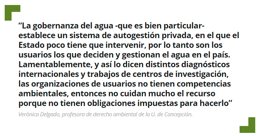 El problema, agregó, es que “la gobernanza del agua -que es bien particular- establece un sistema de autogestión privada, en el que el Estado poco tiene que intervenir, por lo tanto son los usuarios los que deciden y gestionan el agua en el país. Lamentablemente, y así lo dicen distintos diagnósticos internacionales y trabajos de centros de investigación, las organizaciones de usuarios no tienen competencias ambientales, entonces no cuidan mucho el recurso porque no tienen obligaciones impuestas para hacerlo. Tampoco miden mucho la cantidad de agua, y menos calidad, a pesar que con la reforma a la ley de enero de 2018 ahora van a estar obligados a hacerlo”.