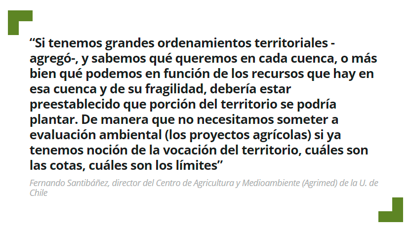 A su juicio, lo que se requiere es revisar los lo realizado en el pasado para no cometer los mismos errores, “como por ejemplo forestar con especies exóticas superficies más allá de lo prudente en una cuenca, alterando incluso su régimen hidrológico, porque no había criterios ni definiciones de hasta que proporción del territorio se podría plantar. Entonces, lo que necesitamos es ordenamiento territorial, y con eso no vamos a necesitar tener que someter al SEIA cada proyecto agrícola, lo que podía incluso desincentivar mucha actividad agrícola”.