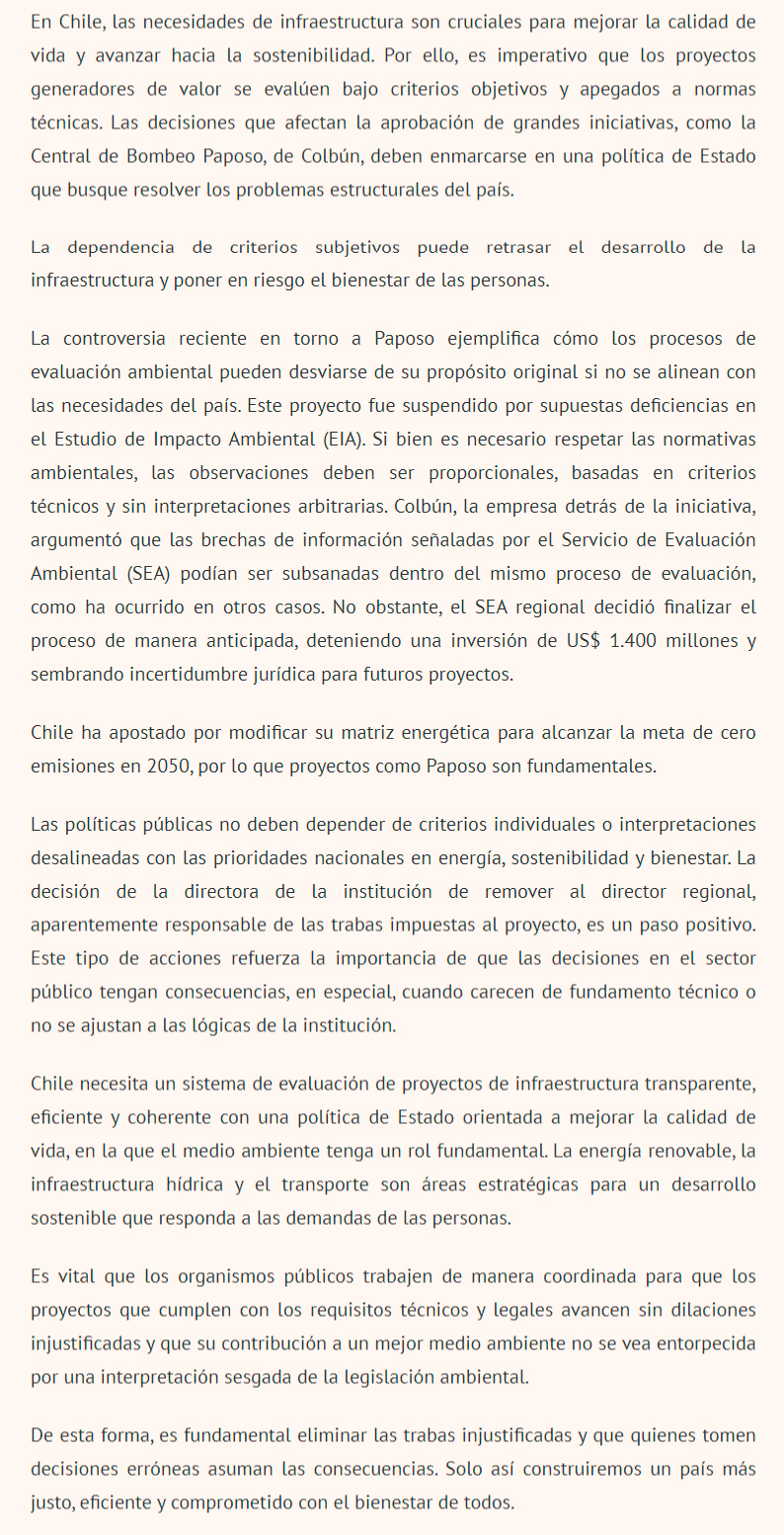 DIARIO FINANCIERO – Chile necesita un sistema de evaluación de proyectos de infraestructura transparente, eficiente y coherente con una política de Estado orientada a mejorar la calidad de vida, en la que el medio ambiente tenga un rol fundamental