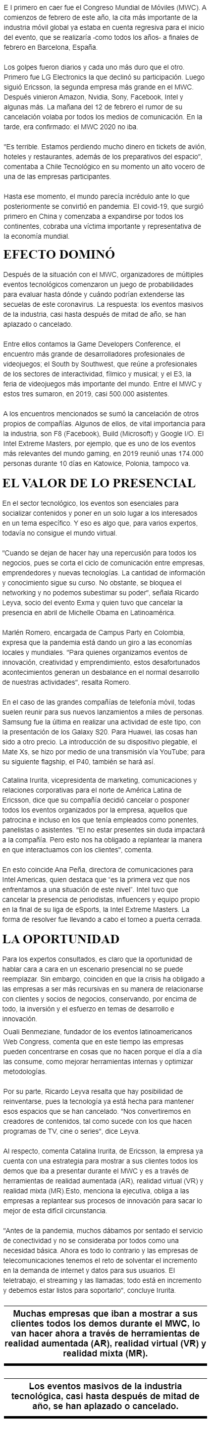 EL MERCURIO – La cancelación de múltiples ferias y congresos tecnológicos en todo el mundo supone un duro golpe para el sector, que con ellos socializa innovaciones, hace negocios y proyecta tendencias que están por venir. ¿Hay oportunidades en medio de la crisis?