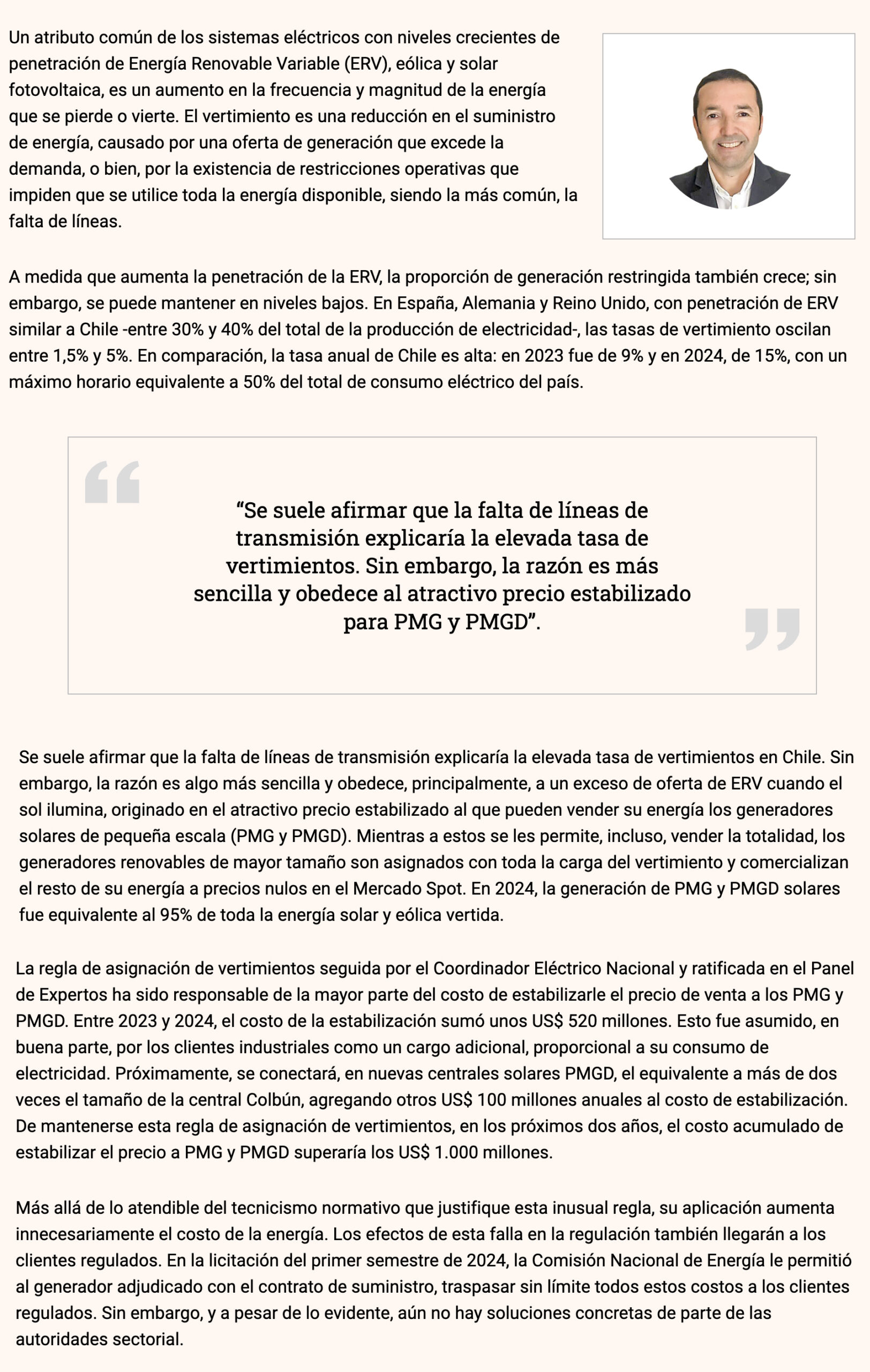 DIARIO FINANCIERO – Se suele afirmar que la falta de líneas de transmisión explicaría la elevada tasa de vertimientos. Sin embargo, la razón es más sencilla y obedece al atractivo precio estabilizado para PMG y PMGD
