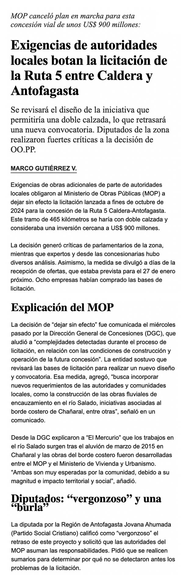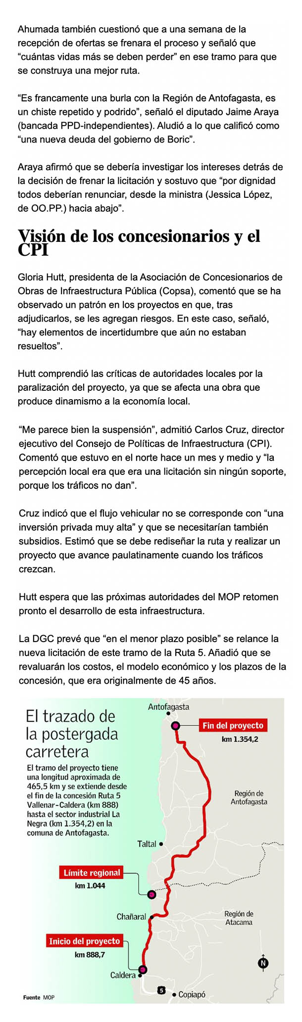 EL MERCURIO – Se revisará el diseño de la iniciativa que permitiría la doble calzada, lo que retrasará una nueva convocatoria. Diputados de la zona realizaron fuertes críticas a la decisión de OO.PP.