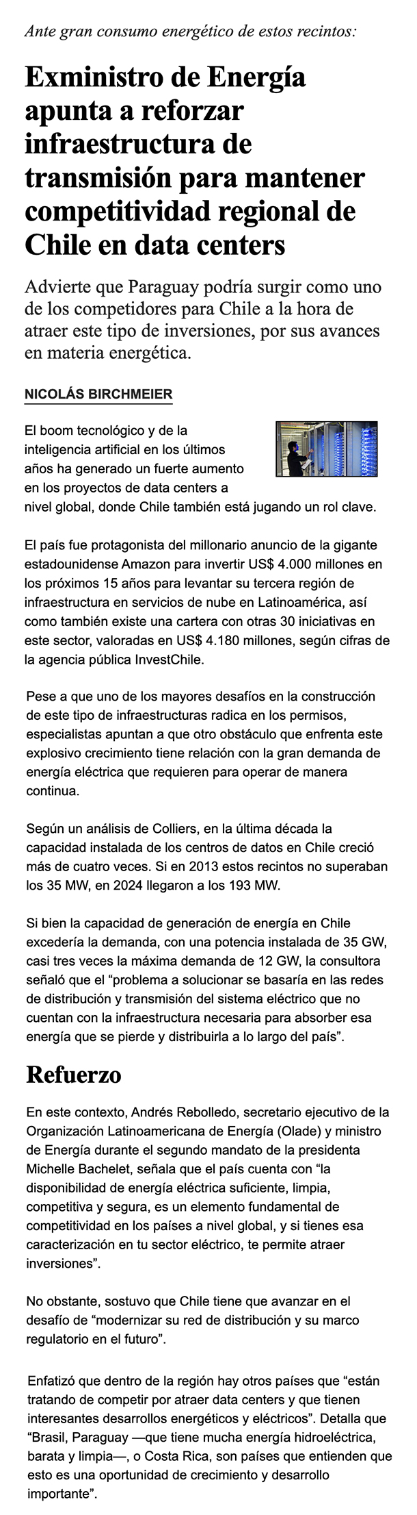 EL MERCURIO – Advierte que Paraguay podría surgir como uno de los competidores para Chile a la hora de atraer este tipo de inversiones, por sus avances en materia energética.