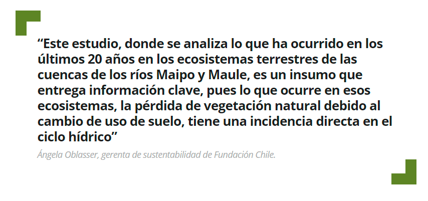 “Este estudio, donde se analiza lo que ha ocurrido en los últimos 20 años en los ecosistemas terrestres de las cuencas de los ríos Maipo y Maule, es un insumo que entrega información clave, pues lo que ocurre en esos ecosistemas, la pérdida de vegetación natural debido al cambio de uso de suelo, tiene una incidencia directa en el ciclo hídrico”, dice Ángela Oblasser, gerenta de sustentabilidad de Fundación Chile.