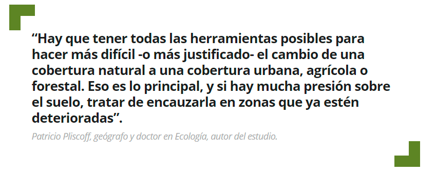 Hoy lo principal, dice Patricio Pliscoff, es evitar “de cualquier forma” el proceso de pérdida de la cobertura. “En el fondo, tener todas las herramientas posibles para hacer más difícil -o más justificado- el cambio de una cobertura natural a una cobertura urbana, agrícola o forestal. Eso es lo principal, y si hay mucha presión sobre el suelo, tratar de encauzarla en zonas que ya estén deterioradas”.