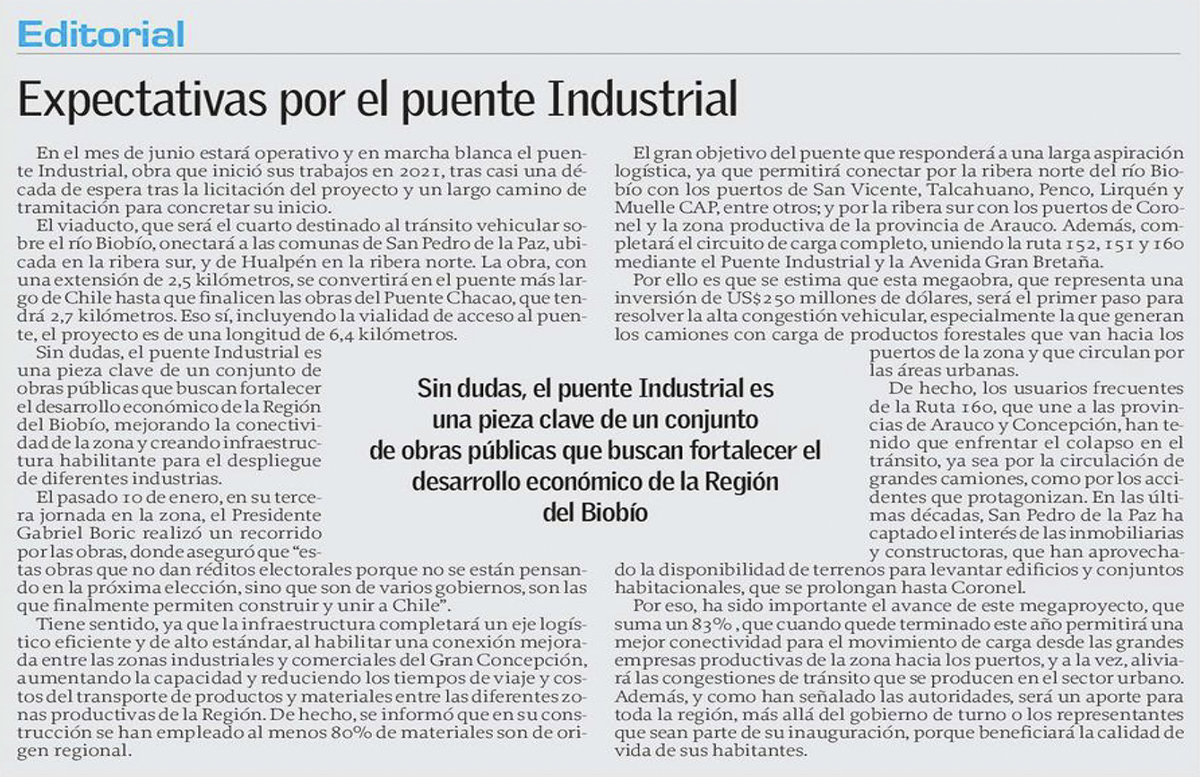 EL SUR DE CONCEPCIÓN – Sin dudas, el puente Industrial es una pieza clave de un conjunto de obras públicas que buscan fortalecer el desarrollo económico de la Región del Biobío