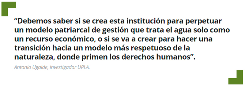 “Es decir, debemos saber si se crea esta institución para perpetuar un modelo patriarcal de gestión que trata el agua solo como un recurso económico, o si se va a crear para hacer una transición hacia un modelo más ecocéntrico, más respetuoso de la naturaleza, donde primen los derechos humanos y el agua sea efectivamente un bien público en cuyo uso prime el interés público por sobre el privado”, señala el investigador, y subraya que es indispensable cambiar el actual modelo, que “durante 40 años ha privilegiado el crecimiento económico y claramente ha fracasado”.