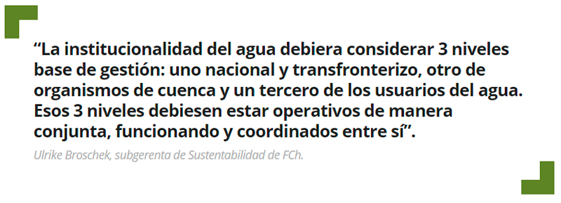 Una mirada distinta es la que plantea la subgerenta de Sustentabilidad de Fundación Chile, Ulrike Broschek, quien considera que la definición de esos organismos de cuenca debiese ser parte de una propuesta integral de nueva institucionalidad del agua.