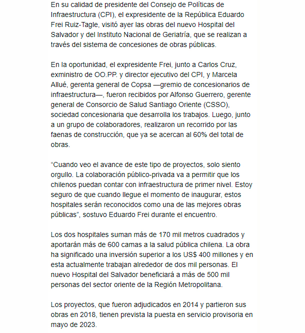 EL MERCURIO – “Cuando veo el avance de este tipo de proyectos solo siento orgullo. La colaboración público-privada va a permitir que los chilenos puedan contar con infraestructura de primer nivel”.