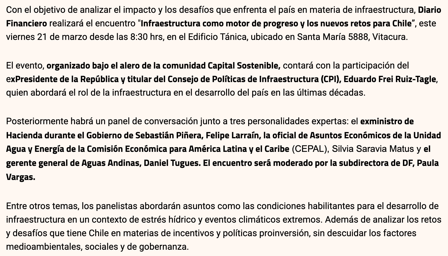 DIARIO FINANCIERO – El evento contará con un panel de expertos para abordar el rol de la infraestructura en el desarrollo sostenible del país.