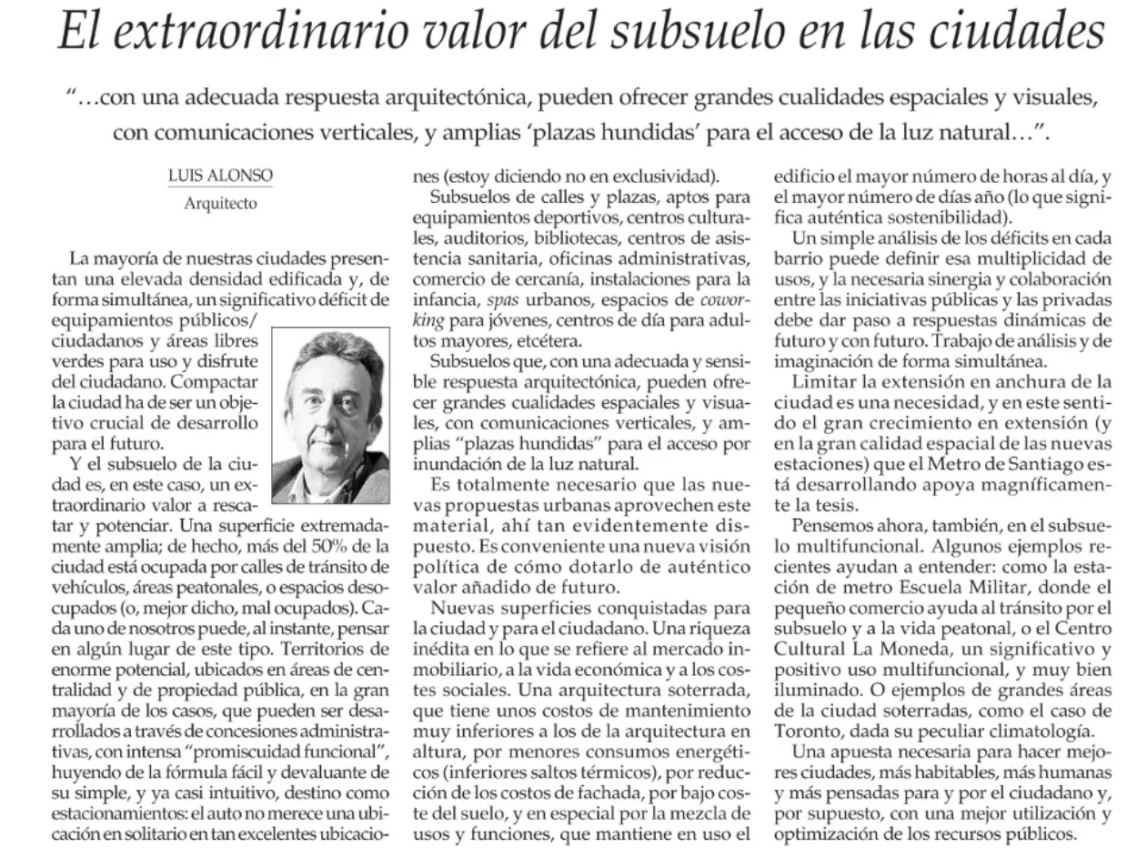 Pensemos ahora, también, en el subsuelo multifuncional. Algunos ejemplos recientes ayudan a entender: como la estación de metro Escuela Militar, donde el pequeño comercio ayuda al tránsito por el subsuelo y a la vida peatonal, o el Centro Cultural La Moneda, un significativo y positivo uso multifuncional, y muy bien iluminado. O ejemplos de grandes áreas de la ciudad soterradas, como el caso de Toronto, dada su peculiar climatología.