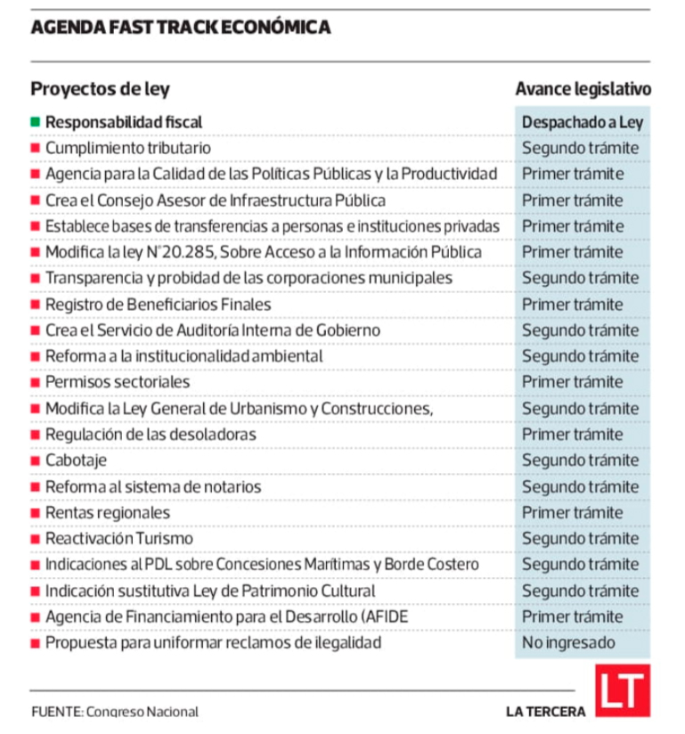 “Hemos discutido y avanzado en acuerdos para impulsar una agenda de proyectos de ley. Ha habido acuerdo en la necesidad de dar una señal importante al país de prioridad, de urgencia en lo que se refiere al impulso al crecimiento, el progreso social y la responsabilidad fiscal. Es importante mostrar compromisos que nos ayuden a avanzar más rápido en esta materia y como producto de ello, concordar la necesidad de establecer un fast track legislativo para proyectos en estas tres dimensiones”, afirmó en ese momento el ministro de Hacienda, Mario Marcel.