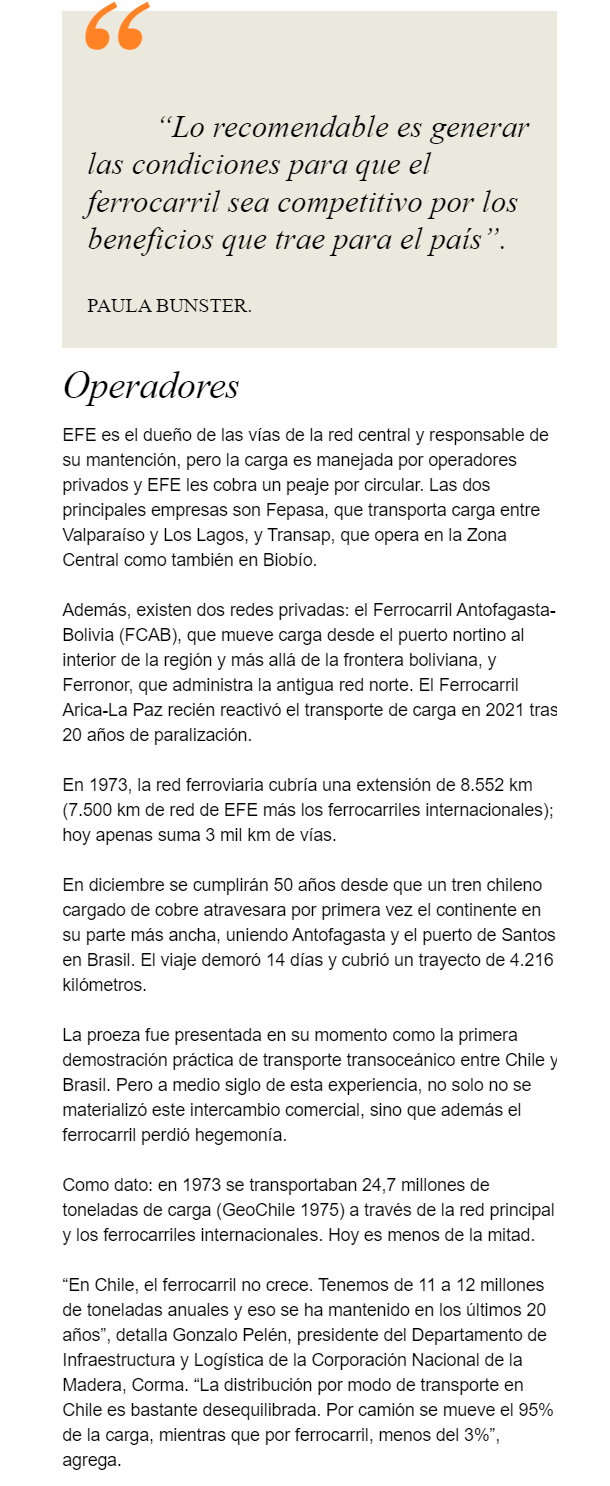 EL MERCURIO – “Lo recomendable es generar las condiciones para que el ferrocarril sea competitivo por los beneficios que trae para el país”, asegura Paula Bunster.