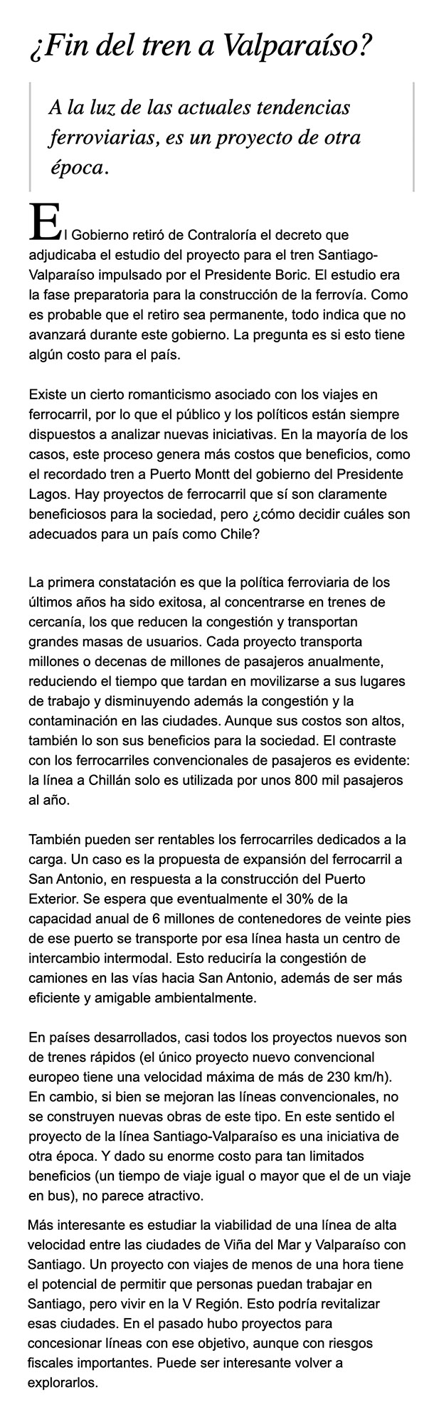 EL MERCURIO – A la luz de las actuales tendencias ferroviarias, es un proyecto de otra época