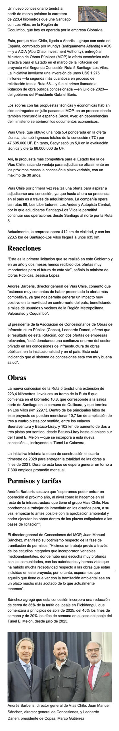 EL MERCURIO – Se trata de Vías Chile, ligada a Abertis y ADIA, que también operan la Ruta 68.