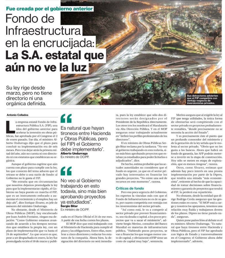 LA SEGUNDA – La empresa estatal Fondo de Infraestructura Pública S.A. (FIP), una idea del gobierno anterior para acelerar la inversión en obras públicas, fue aprobada por el Congreso el 2 de enero pasado. Ese día, el ministro Alberto Undurraga dijo que el plazo para concluir su implementación era de seis meses. Pero tras dejar atrás la primera mitad del año, aún no cuenta ni con directorio ni con estatutos que establezcan su orgánica.