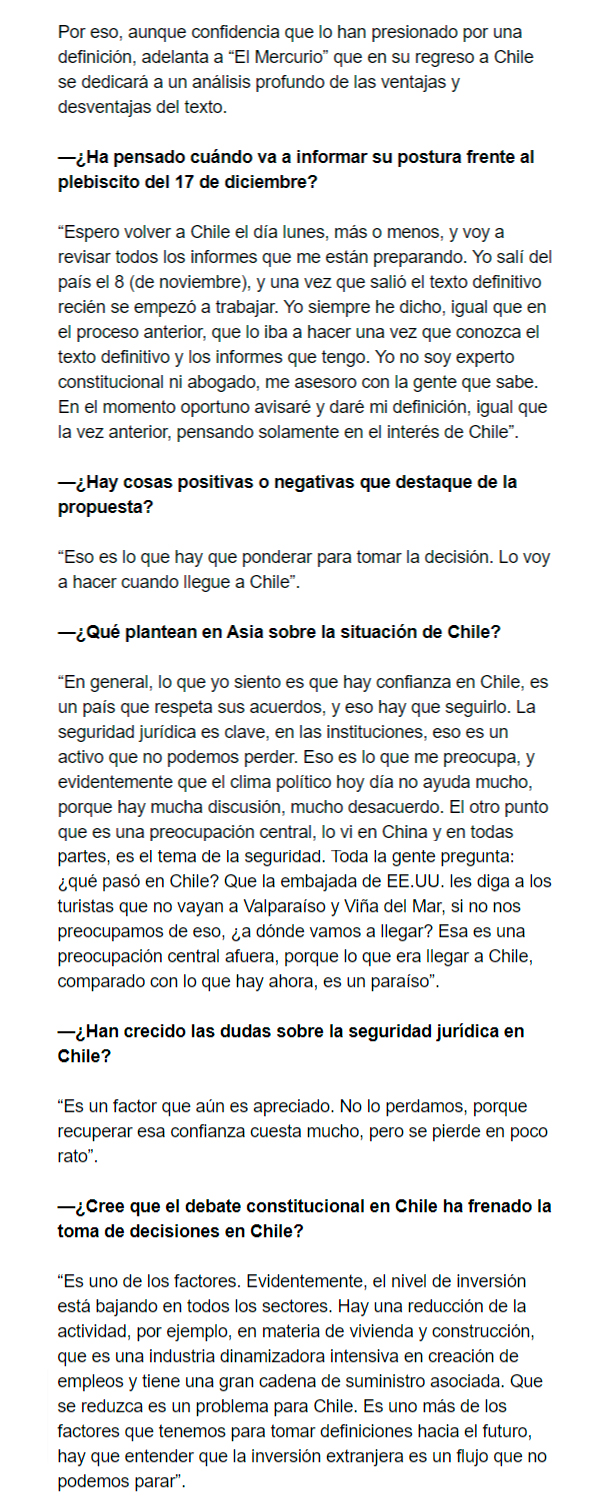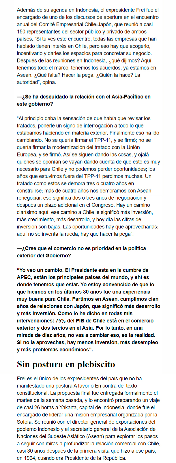 EL MERCURIO – Desde Asia, el expresidente observa las ventajas de la apertura comercial de Chile.