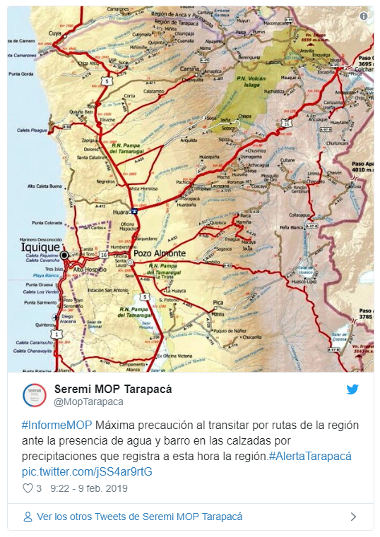 Cabe señalar, que ayer el Presidente Sebastián Piñera viajó hasta Calama para realizar un sobrevuelo y decretó zona de catástrofe en la provincia de El Loa.