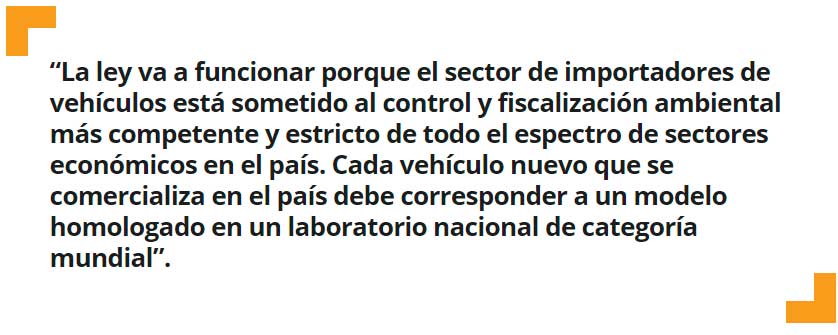 -Va a funcionar porque el sector de importadores de vehículos está sometido al control y fiscalización ambiental más competente y estricto de todo el espectro de sectores económicos en el país. Cada vehículo nuevo que se comercializa en el país debe corresponder a un modelo homologado en un laboratorio nacional de categoría mundial. El Ministerio de Transportes corrobora con fiscalización en los patios de almacenamiento de los vehículos nuevos de las importadoras que realmente las unidades importadas correspondan al modelo homologado.