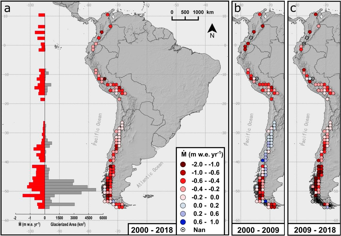 En Chile y el resto de los Andes, en tanto, la gran mayoría de los glaciares está retrocediendo, con solo contadas excepciones de glaciares en la Patagonia que han aumentado su tamaño. El estudio desarrollado por la glacióloga chilena Inés Dussaillant, como parte del equipo liderado por el investigador francés Etienne Berthier y publicado recientemente por la revista Nature, calculó de manera íntegra y homogénea la pérdida de masa de los glaciares de la Cordillera de los Andes durante las últimas dos décadas. La pérdida de hielo es evidente a lo largo de toda la cordillera. Sin embargo, la magnitud de esta pérdida es menor que las estimaciones previas obtenidas con otros métodos.