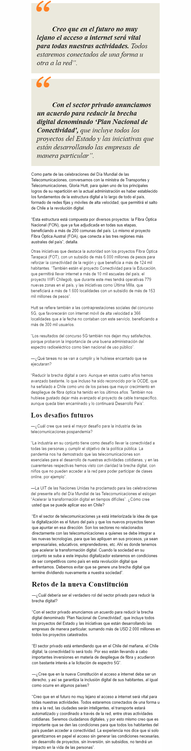 EL MERCURIO – La autoridad destaca el acuerdo sellado con el sector privado para reducir la brecha digital, denominado “Plan Nacional de Conectividad”, que suma más de US$ 2.000 millones en todos los proyectos catastrados.