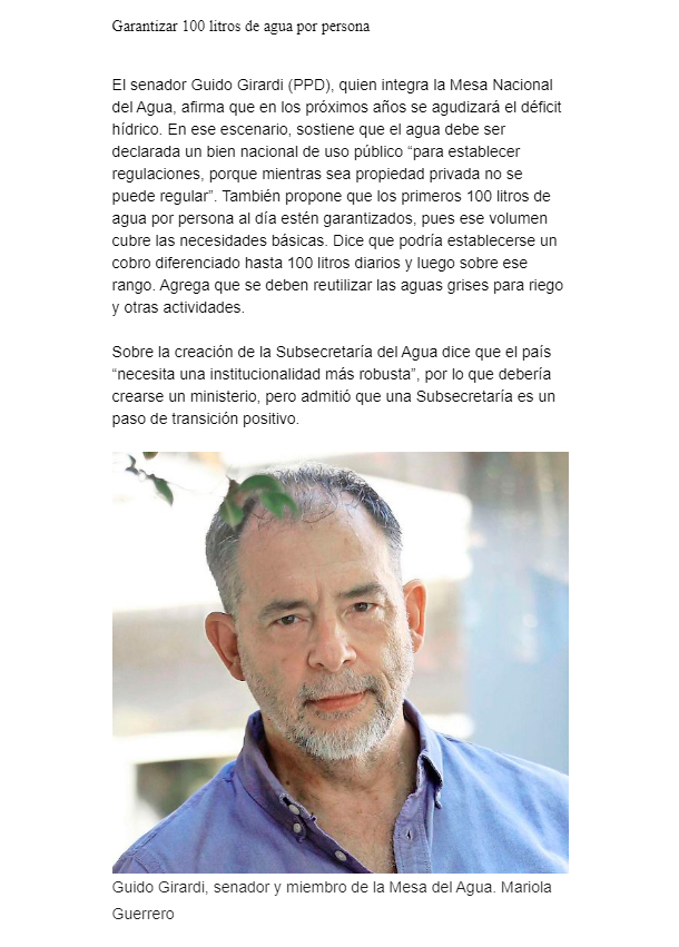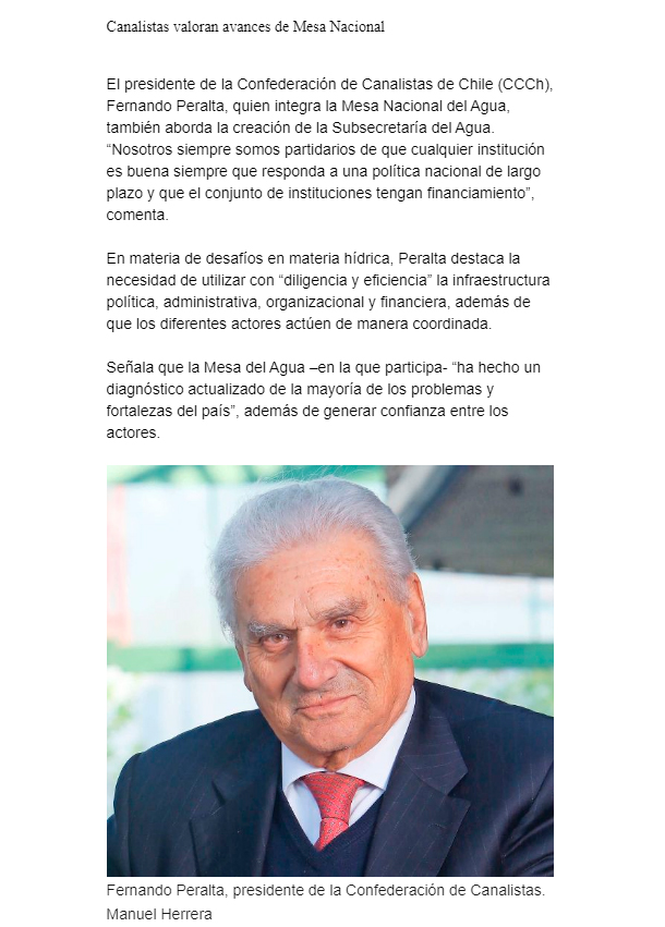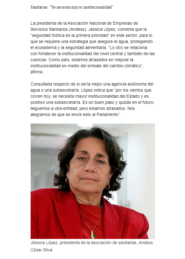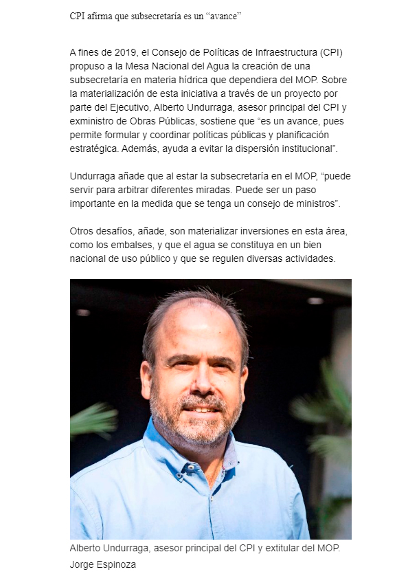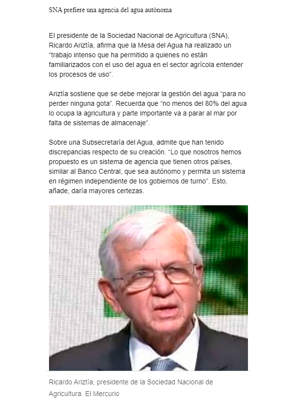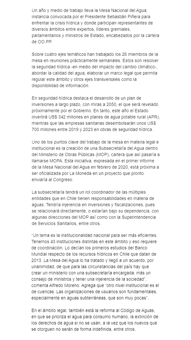 EL MERCURIO – En el marco de la Mesas Nacional del Agua, también se trabaja en un plan de inversiones en infraestructura para los próximos 30 años.