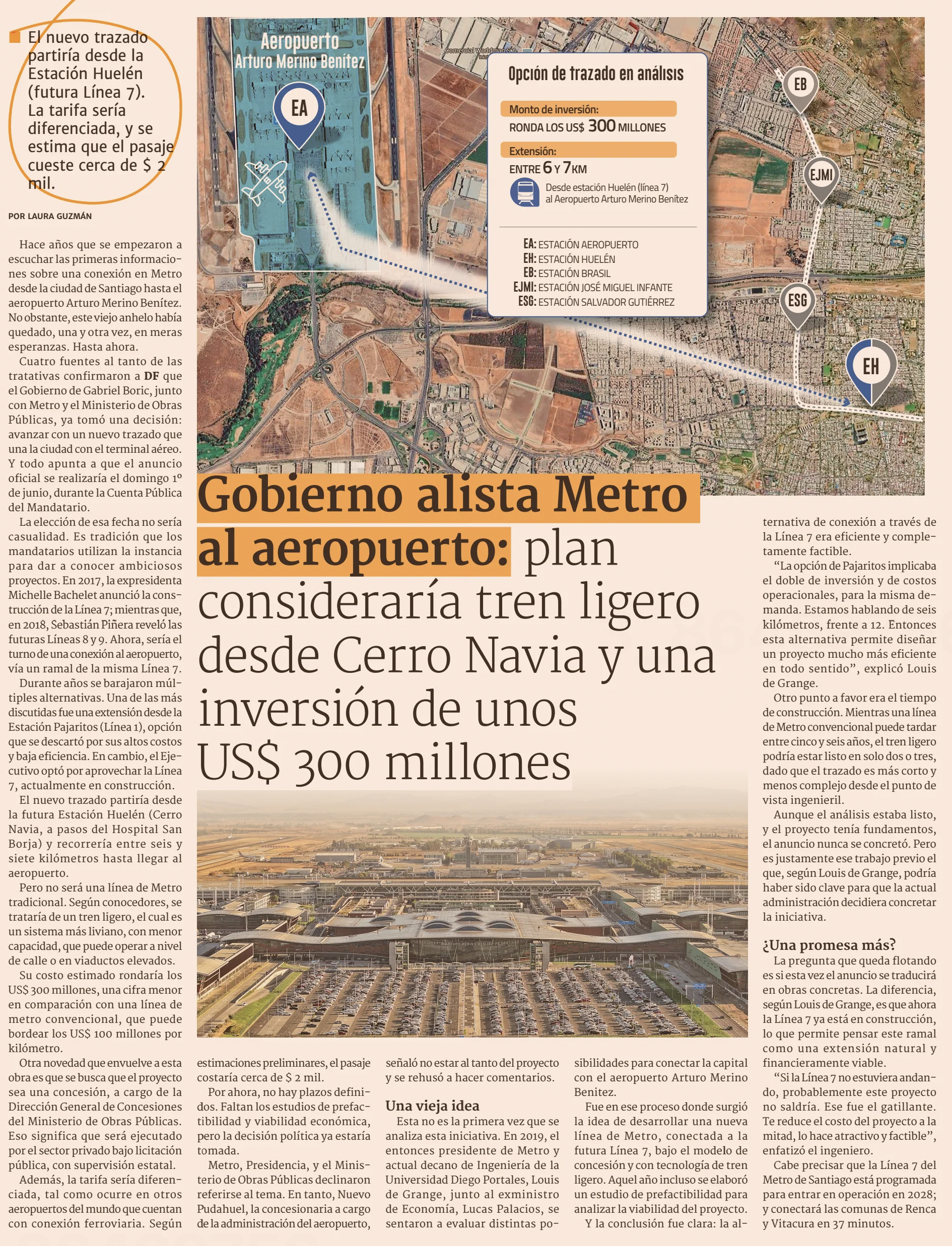 DIARIO FINANCIERO – Cuatro fuentes al tanto de las tratativas confirmaron que el Gobierno de Gabriel Boric, junto con Metro y el MOP, ya tomó una decisión: avanzar con un nuevo trazado que una la ciudad con el terminal aéreo.