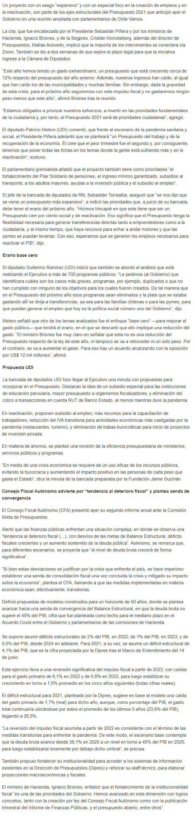 Gobierno anticipa Presupuesto 2021 “expansivo” y con foco en empleo y recuperación