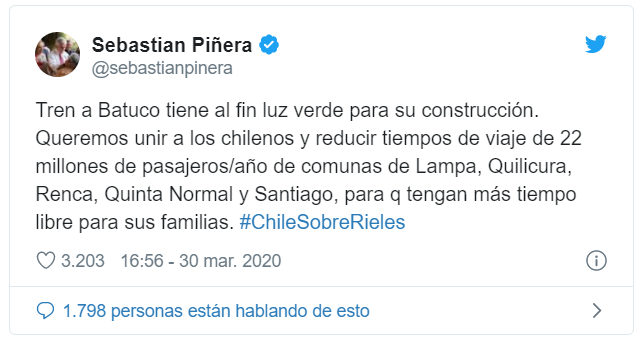 “Tren a Batuco tiene al fin luz verde para su construcción. Queremos unir a los chilenos y reducir tiempos de viaje de 22 millones de pasajeros/año de comunas de Lampa, Quilicura, Renca, Quinta Normal y Santiago, para que tengan más tiempo libre para sus familias”, declaró el Mandatario.