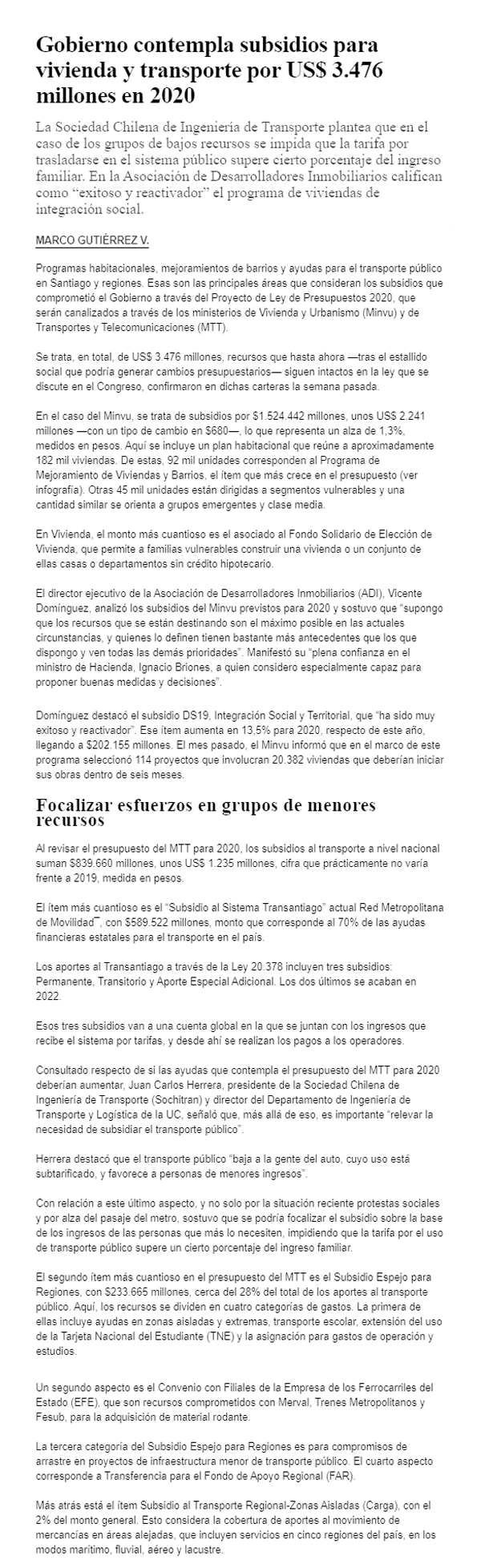 EL MERCURIO – Ayudas estatales en el Proyecto de Ley de Presupuestos del MTT se mantienen respecto de 2019 y en el Minvu suben 1,3%