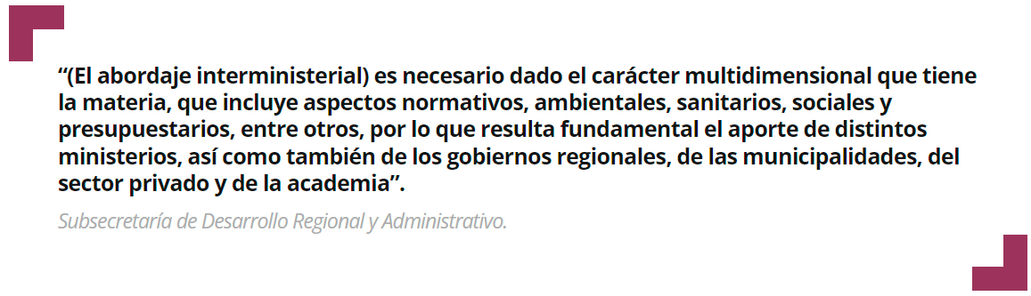 En este sentido, desde la Subdere señalan a este medio que el abordaje interministerial es necesario “dado el carácter multidimensional que tiene la materia, que incluye aspectos normativos, ambientales, sanitarios, sociales y presupuestarios, entre otros, por lo que resulta fundamental el aporte de distintos ministerios, así como también de los gobiernos regionales, de las municipalidades, del sector privado y de la academia”.