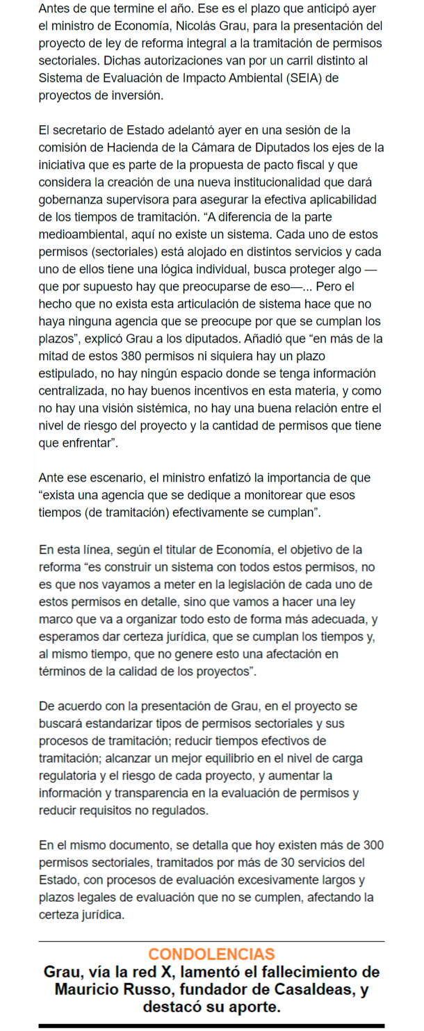 EL MERCURIO – Ministro de Economía dijo que idea es parte de reforma integral a tramitación, que se presentará antes de fin de año.