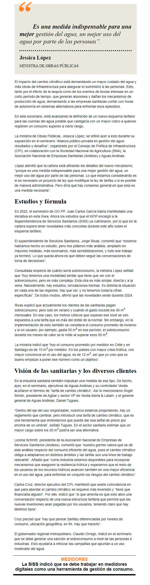 EL MERCURIO – En Aguas Andinas son partidarios de una “tarifa de cambio climático” que aplique un cargo mayor sobre cierto umbral de gasto.