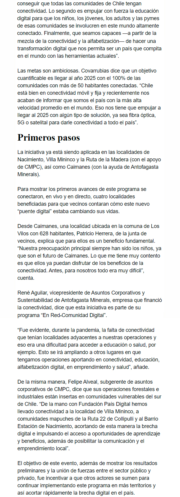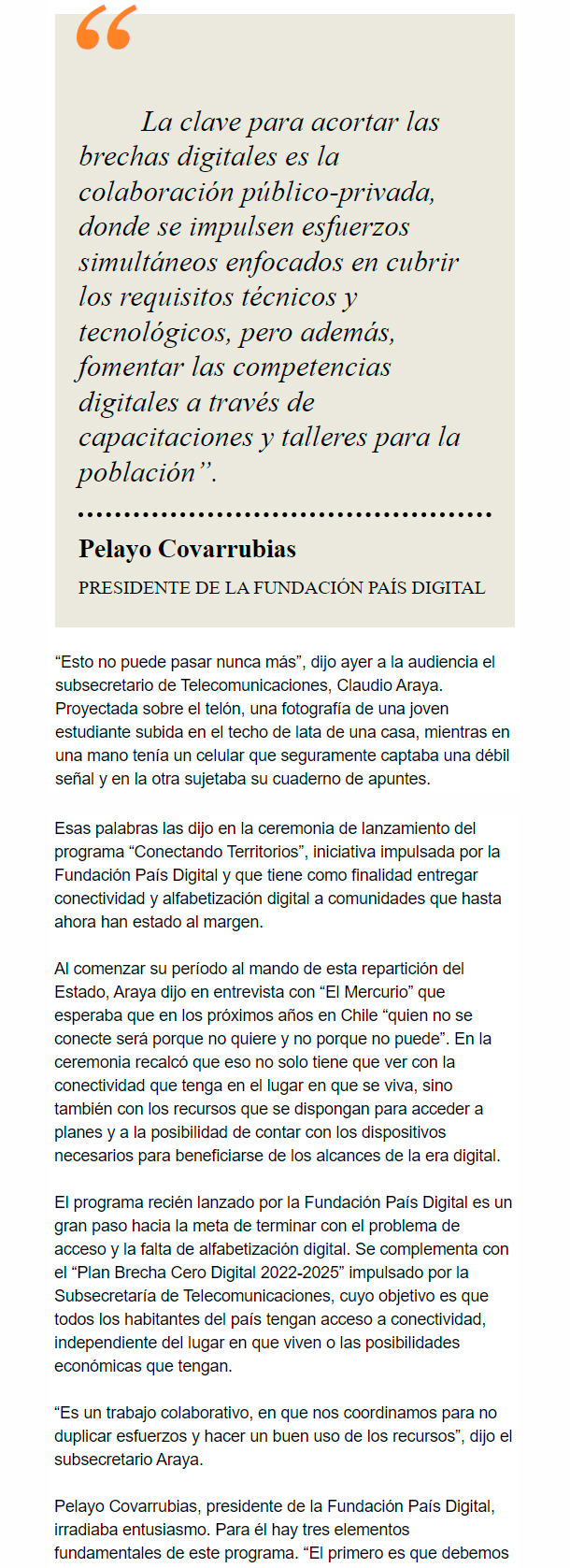 EL MERCURIO – Se trata de una iniciativa público-privada que tiene una ambiciosa meta: que ninguna localidad con más de 50 habitantes se quede fuera de los beneficios de tener un enlace a internet.